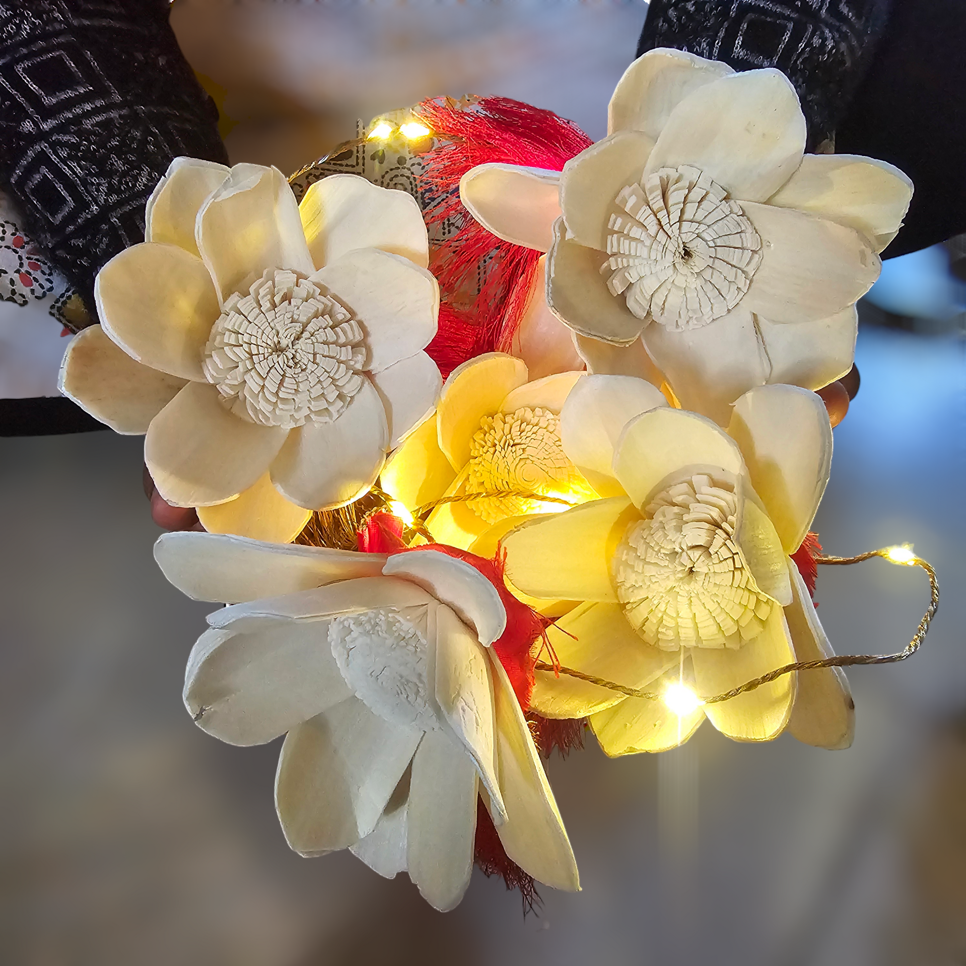 - Material: Shola flowers, colorful tassels, and fairy lights